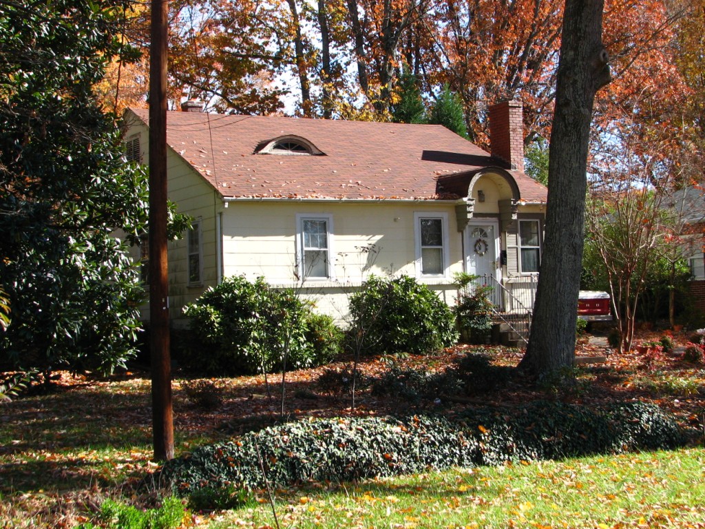 This one-story, frame, Minimal Traditional-style house is sheathed with asbestos-shingle siding, except the façade beneath window height, which is brick-veneered. The side-gable roof has an eyebrow window with a glass fanlight, an unusual feature in the district. There are two chimneys: an exterior brick chimney on the south end of the house positioned forward of the roof ridge, and a rear brick chimney. Windows are six-over-six sash. On the asymmetrical two-bay façade, concrete steps rise to the off-center door flanked by two windows. Another window is located at the center of the north half of the façade. Above the front door, an unusual and distinctive tall, round-arched hood set on stepped and scrolled brackets emerges from the front slope of the roof. An outbuilding appears to be behind the house, but it could not be seen well enough to be recorded. R. L. Mayberry and his wife may have been the first owners of the house, having purchased the property in July 1936, but the house changed ownership numerous times after that. John Lewis, station manager at Piedmont Aviation, and his wife, Doris, lived here from 1947 to 1955. Walter and Sallie Cartwright were the longest owners, living here from1964 until 1985. Before Walter’s retirement, he and Sallie lived at 1551 Polo Road (no longer standing) where he was the long-time caretaker of Edgar Davis’s Sunnynoll Farm on Reynolda Road at Polo Road. (TR, CD; Kent Strupe email, February 2, 2016)